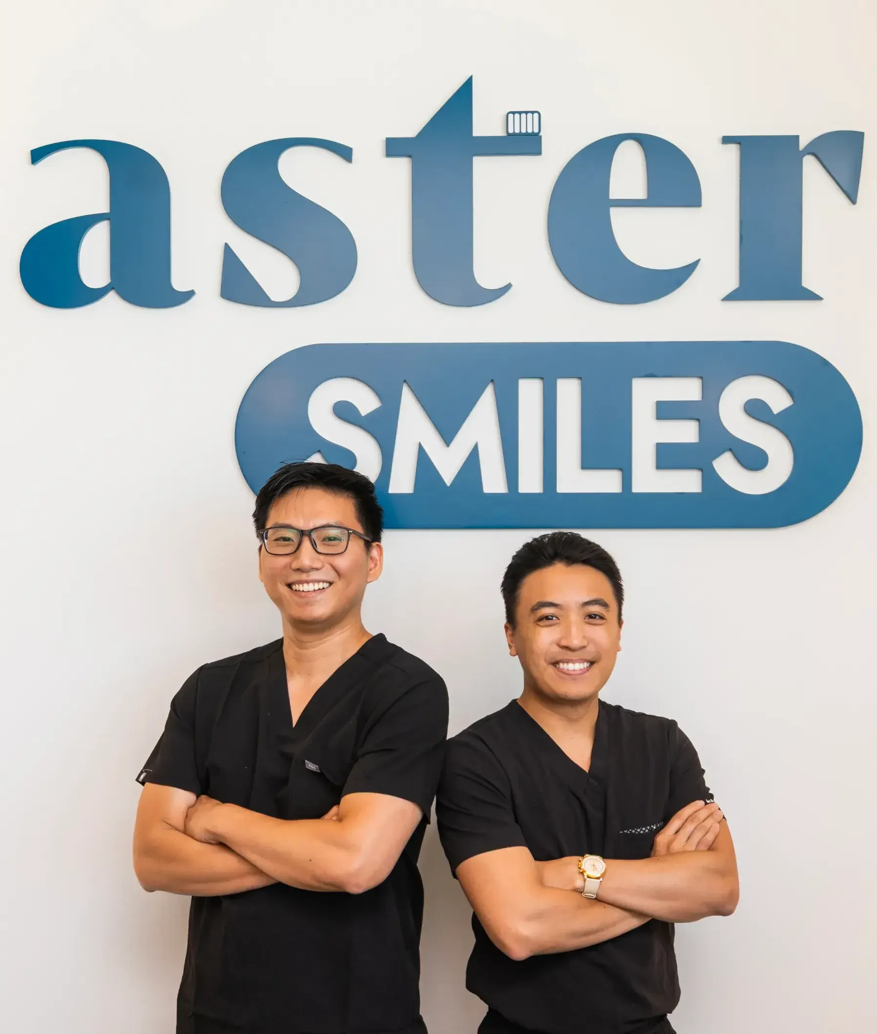 Gemini said Dr. Thanh Huynh and a colleague standing proudly in front of the AsterSmiles office logo.
